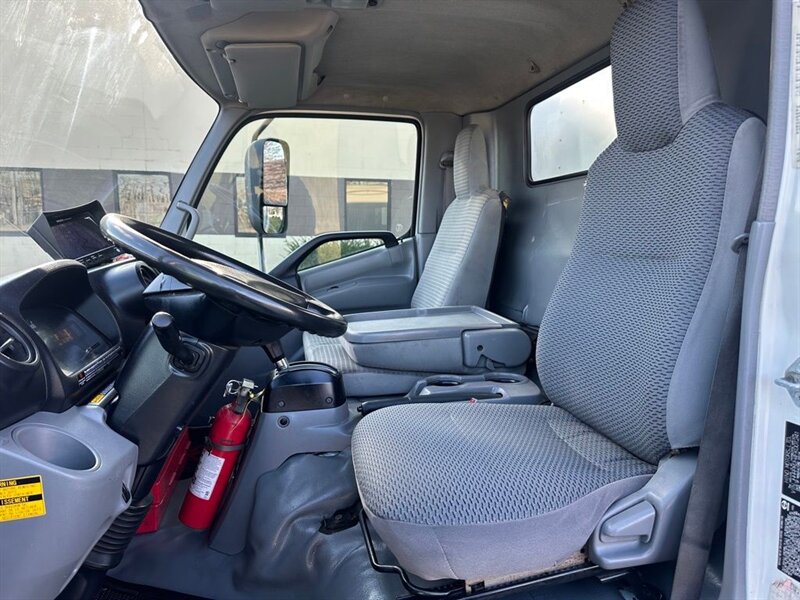 This 2015 Hino 195 is a medium-duty cab-over truck powered by the Hino J05E-UG 5.1L inline-4 turbocharged diesel engine, rated at 210 hp and 440 lb-ft of torque. The vehicle presents in excellent overall condition and shows under 117,000 miles — averaging less than 10,000 miles per year — making it a low-to-moderate-use example for its model year. Exterior is finished in white; the cab interior is black.